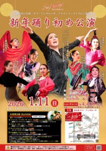 2026年1月11(日) 新年踊り初め公演に青木愛子スペイン舞踊団が出演 @サラ・アンダルーサ Open 18:00 Stage 19:00~ Bailaora 秋田まゆみ、泉まどか、岩崎祐希子、遠藤真紀、諏訪部智子、本間晃好、牟田真弓 Guest Bailaora AMI(鎌田厚子) Guitarrista 高橋紀博 Cantaora 森薫里 Violinista 森川拓哉