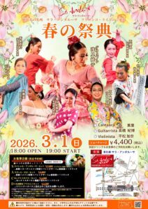 2026年3月1日(日) 春の祭典公演に青木愛子スペイン舞踊団が出演 @サラ・アンダルーサ Open 18:00 Stage 19:00~ Bailaora 中島圭子、新善美、五十嵐桂子、折金志乃、久間ひとみ、近藤泉、濱口妃登美 Guest Bailaora 浅見純子 Guitarrista 高橋紀博 Cantaora 森薫里 Violinista 平松加奈