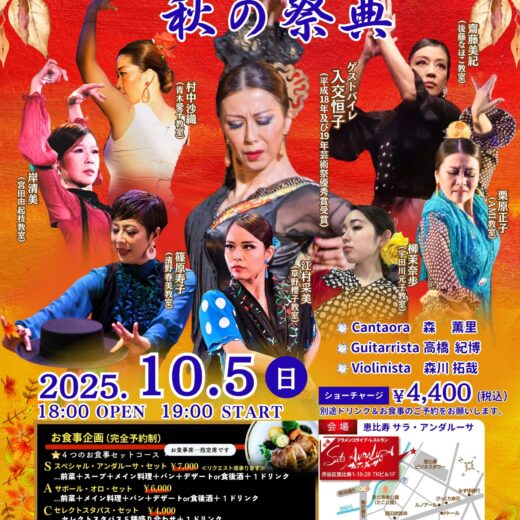 2020年11月21日(土) 晩秋特別ライブ に青木愛子スペイン舞踊団が出演 @サラ・アンダルーサ Open 18:00 Stage 19:00~ Bailaora 森野麻紀、泉まどか、宇賀神恵、杉山須美江、牟田真弓、諸富礼 guest Bailaora 草野櫻子 Guitarra いわねさとし Cante 森薫里 Violin Yui